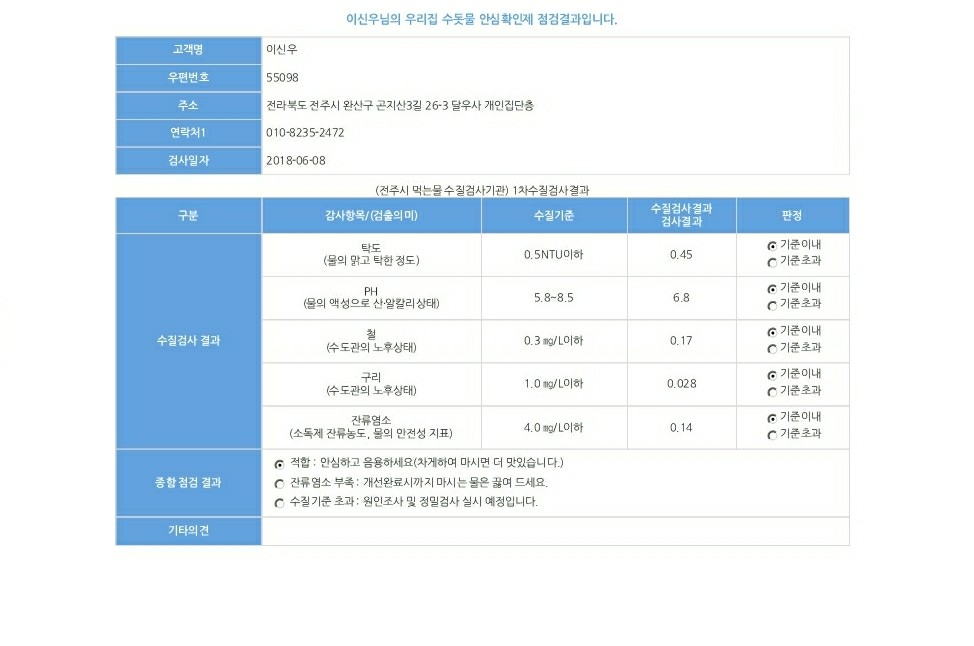 ¹«·á·Î ¼öµ¾¹° °Ë»ç¸¦ ÇÏ°í¼ ¿ì¸®Áý ¹°À» ¸¶½Ç¼ö ÀÖ´ÂÁö....È®ÀÎÀÌ °¡´ÉÇÕ´Ï´Ù...°Ë»ç°á°ú ÀûÇÕÀ¸·Î ³ª¿À¸é ¹Ù·Î ¸¶½Ç¼ö ÀÖÀ¾´Ï´Ù.